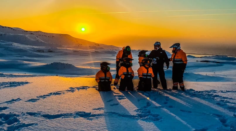 While the south is certainly spectacular from "below” nothing beats experiencing it from "above”, snowmobiling on top of Eyjafjallajökull glacier. The snowmobile tour is the perfect length of time for first-time riders and individuals looking for a scenic, fun ride, exploring and experiencing the wilderness, glacier and the breathtaking views over South Iceland in good weather. The tour starts from our base, after a short briefing and dressing up in a snow suit we step into a Super jeep and we drive up the mountain, to the glacier where we pick up the snowmobiles and ride to the glacier Eyjafjallajökull.