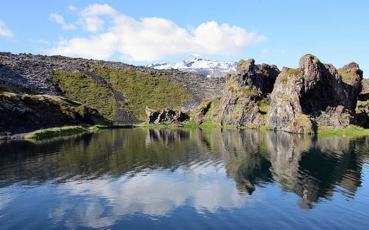 On the way, you will have a nice view of Bjarnarfoss, a beautiful waterfall falling behind a farmhouse.