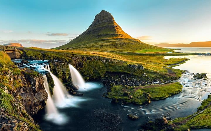 Kirkjufell, one of Iceland's most distinctive mountains, attracts people's attention with its unusual shape and is a fantastic stop on our Private Luxury Jeep Tour of the Snæfellsnes Peninsula. Kirkjufellsfoss, a little waterfall on the opposite side of the road from the mountain, is a popular sight to visit since it allows you to snap excellent shots of the mountain from there.