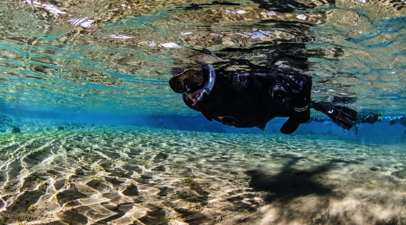 On the snorkeling tour we will dress you in a dry suit and guide you through the four parts of the Silfra fissure. Floating through Silfra's crystal clear water is an otherworldly experience; the near-freezing water, astonishing colors, and sensations of flying provide a very unique environment for liquid meditation that you will never forget.