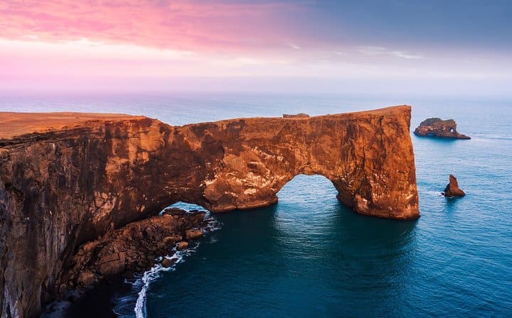 Then we head to Dyrhólaey promontory to observe Iceland's wide coastline lines from a higher vantage point, and to Reynisfjara, which enchants visitors for its black sand beaches, sea stacks, and basalt columns. Puffin colonies may be found near the Dyrhólaey cliffs in the summer, and you may even get a glimpse of these lovely birds that have become a symbol for Iceland.
