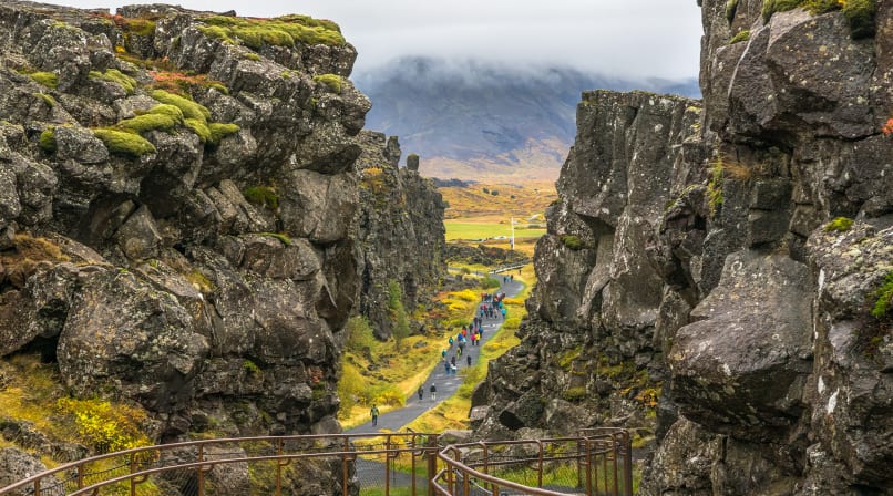 The first stop on our Premium Golden Circle Tour is Thingvellir National Park, known for being the site of the first parliament in the world. Thingvellir is also interesting because it sits in a rift valley where the European and the North American tectonic plates are separating.